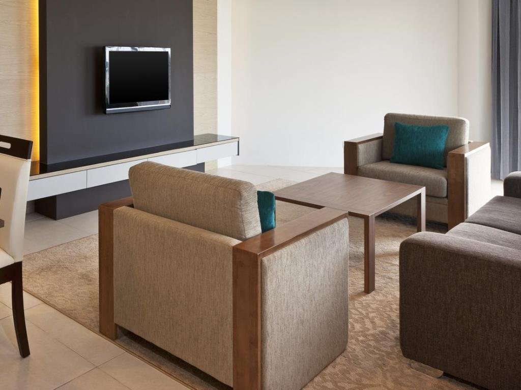 كما يوجد منطقة للجلوس، وميني بار، وماكينة لصنع الشاي والقهوة، وخزنة حديدية، وغيرها من الديكورات والمقاعد المريحة، كما يوجد بداخل الغرف حمام متكامل وفسيح خاص بالنزلاء به كافة لوازم الاستحمام.