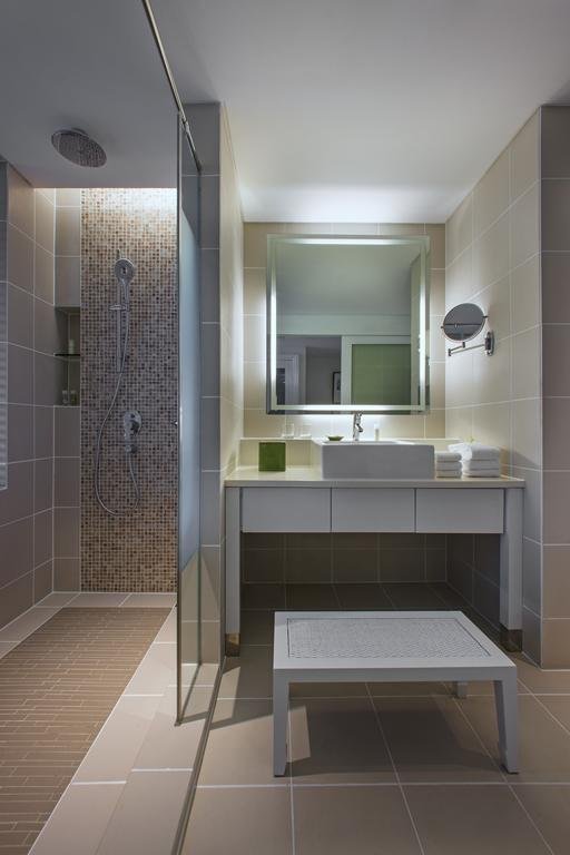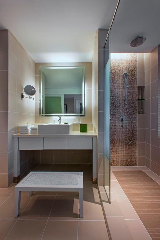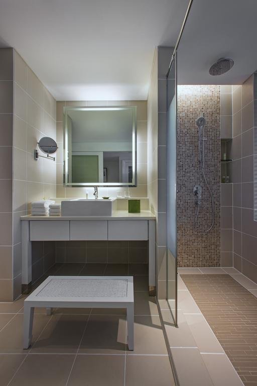 حمام الغرفة لا يقل أناقة عن الغرفة ذاتها، فهو بمثابة قطعة مُكملة لباقي الديكور، فالحمام مُجزأ ثلاثيًا جزء للمرحاض وجزء لحوض الاستحمام الواسع وبجواره حامل مناشف بمثابة قطعة فنية، والجزء الثالث لحوض لغسيل الأيدي.